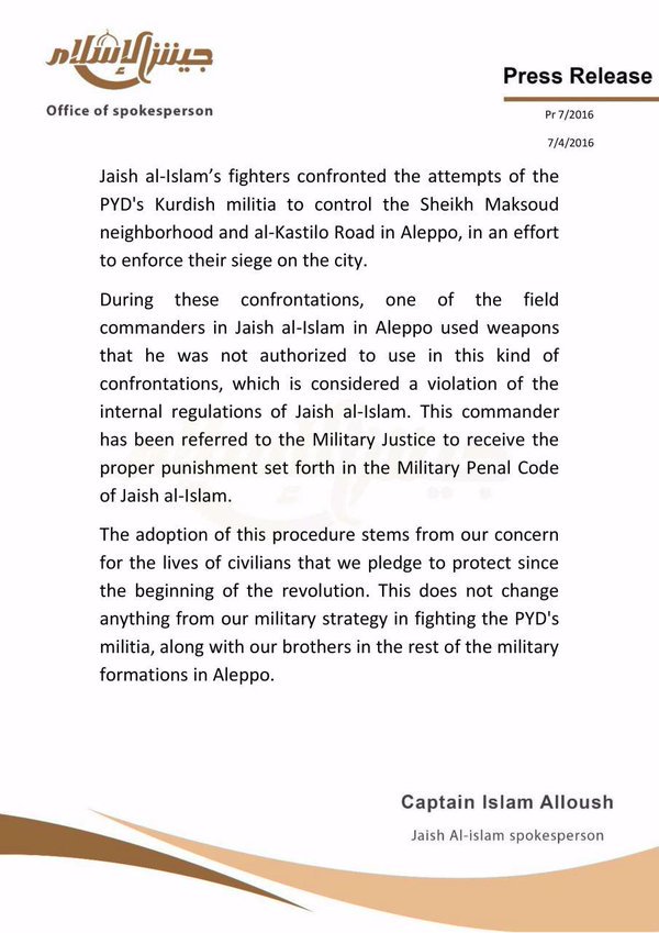 SYRIA: Jaish al-Islam arrest commander for using unauthorized weapons in attack on Sheikh Maqsood in #Aleppo.