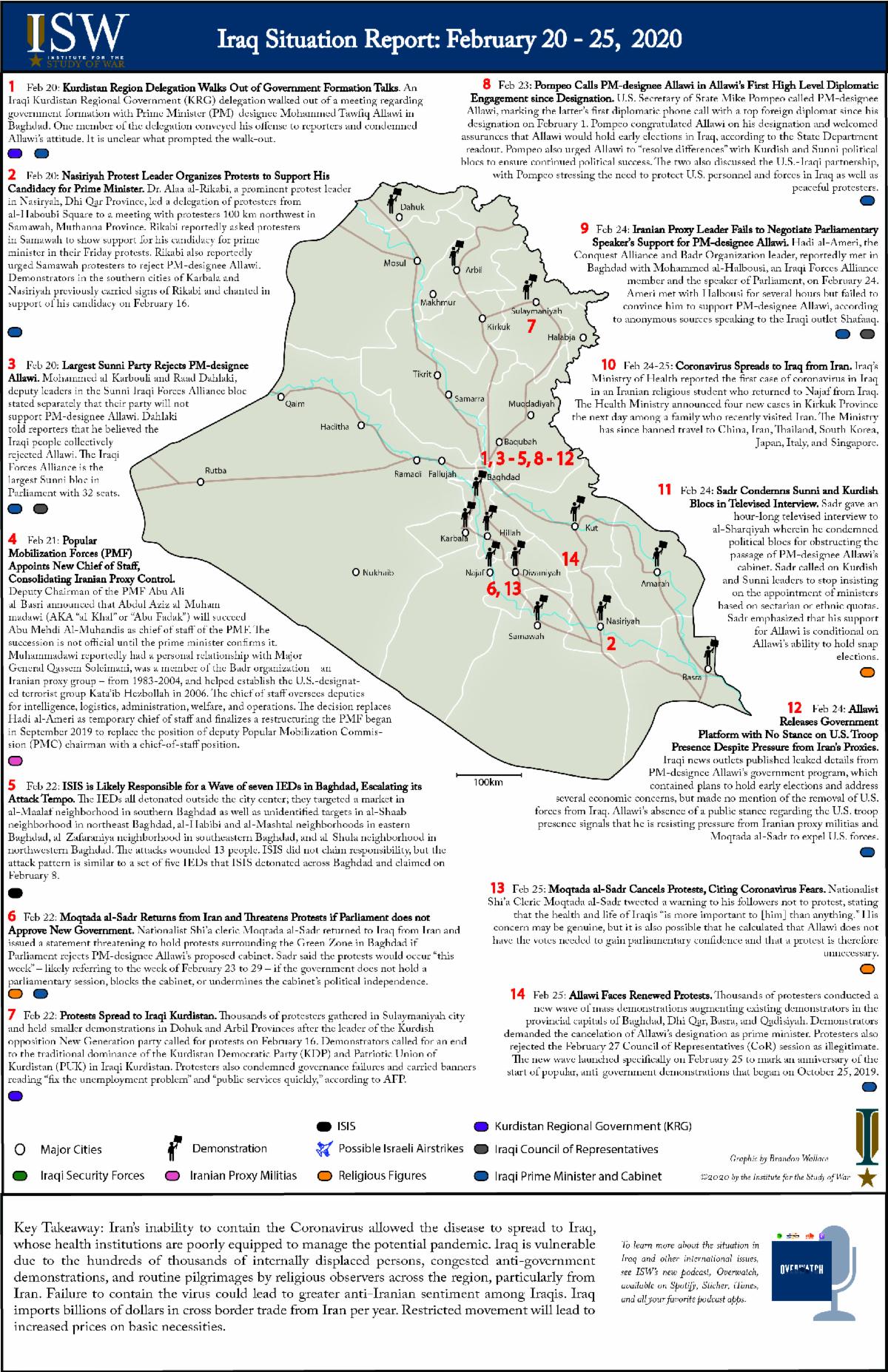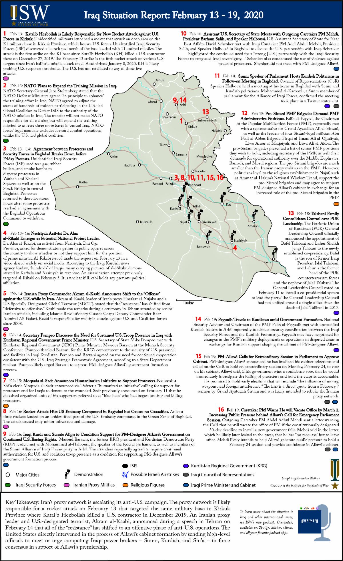 ISW is assessing the ongoing unrest and its effects on political-security dynamics in Iraq. The Iraq Situation Report (SITREP) map series summarizes key events and likely developments to come. The following set of SITREP maps covers the period February 13 – 25, 2020.