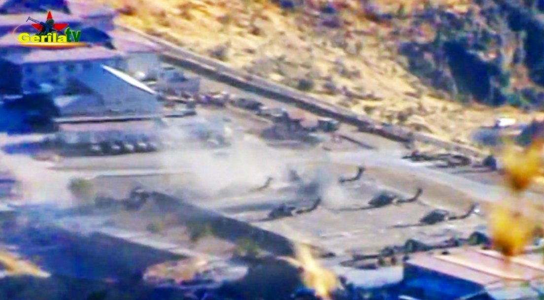 MESOP EXCLUSIV : Screenshot from upcoming PKK video where they attack a Turkish army base, destroying several helicopters on 5 Sept.