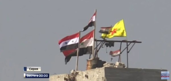 On Monday, the Assad regime flag was raised alongside a Kurdish banner for the first time in Aleppo — the picture is from Bustan al-Basha, which the YPG occupied earlier in the day