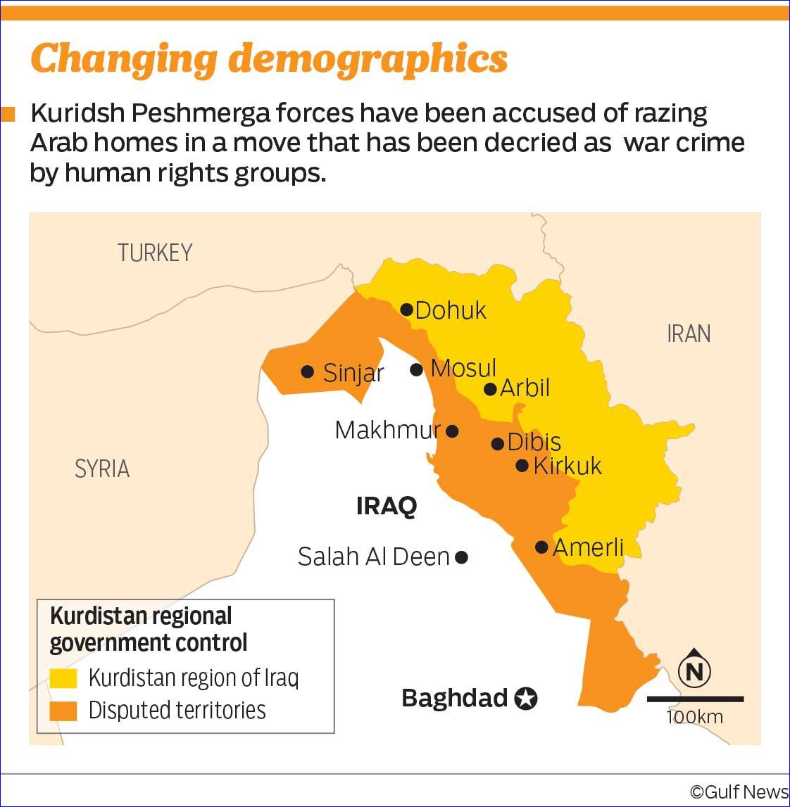 Ali Allawi, a former Iraqi defence minister and current research professor at The National University of Singapore, told Gulf News: “There is no doubt that the expulsion of the Kurds in the Arab/Kurdish borderlands of Iraq in the 1970s and 1980s were designed to change the ethnic composition of the area for the ideological (Arab nationalist rhetoric) and security reasons of a totalitarian state. Now, we have an attempt to change the demographic composition for specifically nationalist reasons as a basis for an ethnically homogeneous or indisputably majoritarian Kurdish proto-state. Both programmes run counter to the idea of an accommodating multi-ethnic, multicultural Iraqi homeland.”