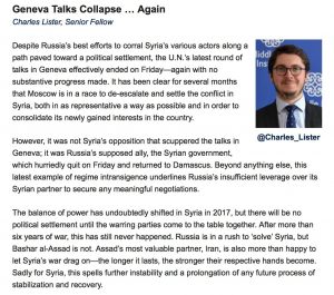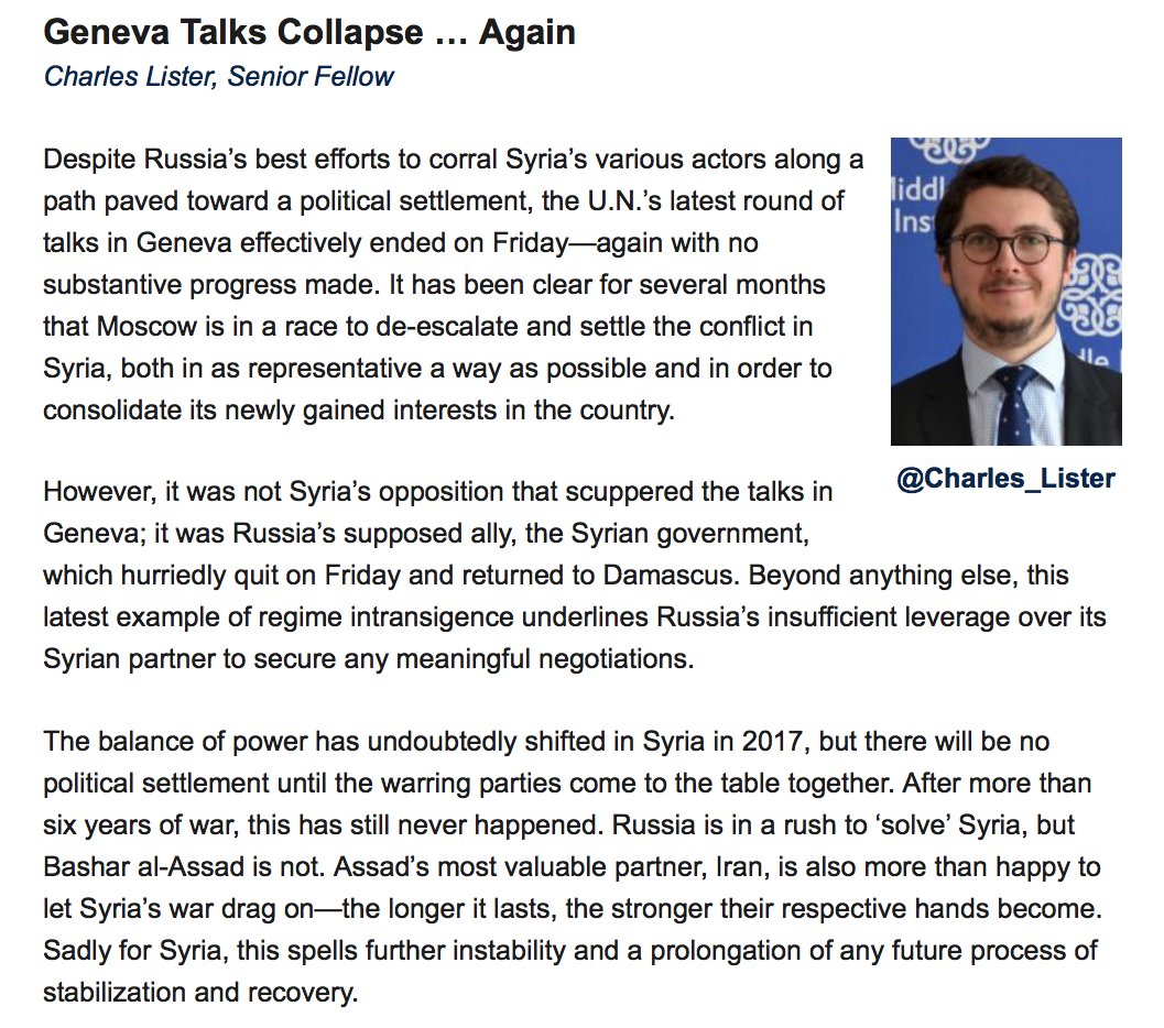 Charles ListerVerified account @Charles_Lister 4 Dec 2017 – My latest comments on #Syria talks in #Geneva, for @MiddleEastInst: – “#Assad regime intransigence underlines #Russia’s insufficient leverage… #Moscow is in a rush to ‘solve’ Syria, but Bashar al-Assad is not.” http://www.mei.edu/content/flash/2017-12-4 …