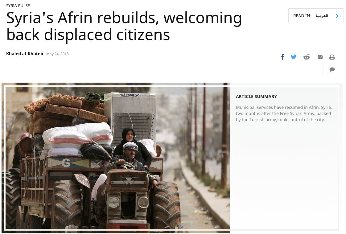 #Afrin, today: – Commerce recovering – IDPs returning – Bakeries revamped – Street cleaning back – Midanki dam repaired – Desalination plant repaired – Running drinking water back – Sewage network fixed – Civil defense activated – Security improving https://www.al-monitor.com/pulse/originals/2018/05/syria-afrin-turkey-fsa-return-services-displaced.html?utm_source=dlvr.it&utm_medium=twitter