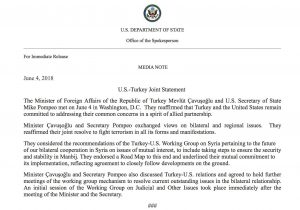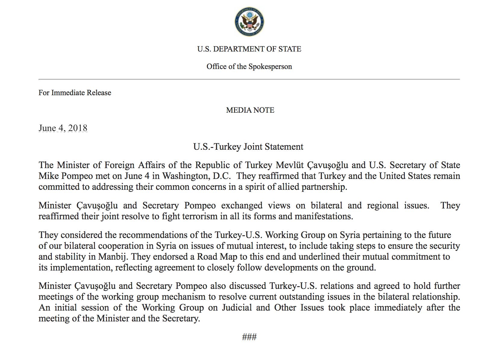 MESOPOTAMIA NEWS EXCLUSIV : Joint statement from #America and #Turkey after the Pompeo-Cavusoglu meeting at the @StateDept: they agreed to the Road Map proposal over Minbij and to “fight terrorism in all its forms and manifestations”. 4 June 2018